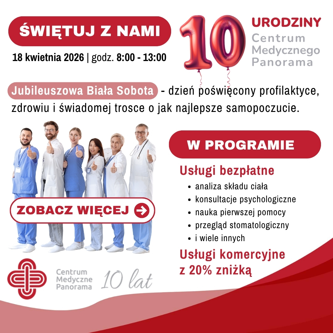 AKTULNOĆCI 10 urodziny Centrum Medycznego Panorama. Jubileuszowa BiaĆa Sobota </h1 > ĆwiÄtuj z nami 10-lecie Centrum Medycznego Panorama 18 kwietnia 2026 r. odbÄdzie siÄ nasza Jubileuszowa BiaĆa Sobota - dzieĆ