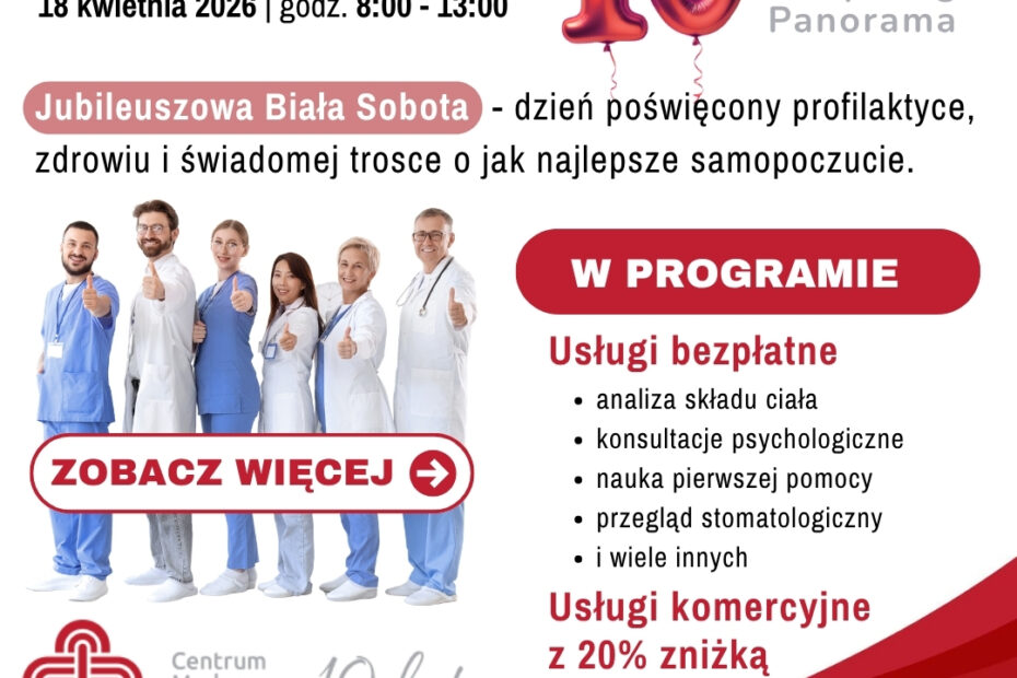 AKTULNOŚCI 10 urodziny Centrum Medycznego Panorama. Jubileuszowa Biała Sobota </h1 > Świętuj z nami 10-lecie Centrum Medycznego Panorama 18 kwietnia 2026 r. odbędzie się… Dowiedz się więcej »10 urodziny Centrum Medycznego Panorama! Jubileuszowa Biała Sobota.